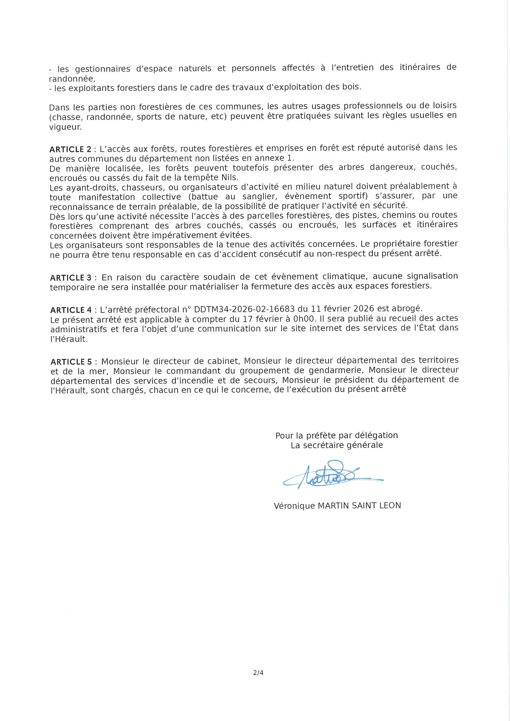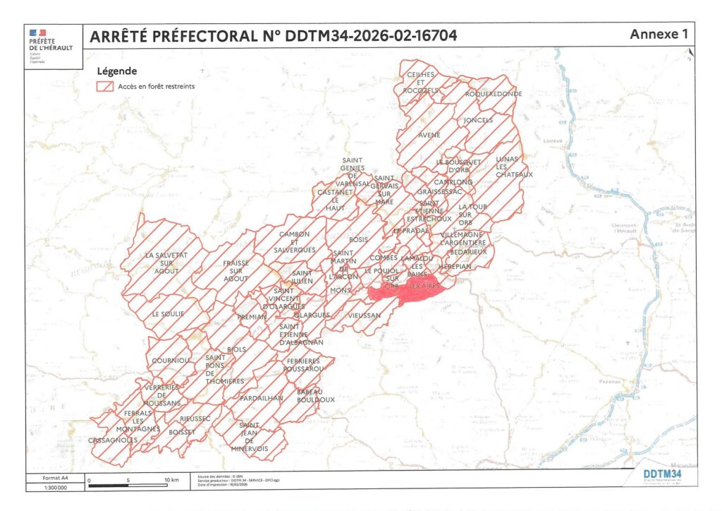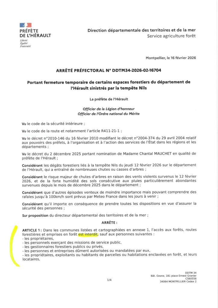 Arrêté préfectoral portant fermeture temporaire de certains espaces forestiers du département de l’Hérault sinistrés par la tempête Nils.La commune des AIRES EST CONCERNEE.