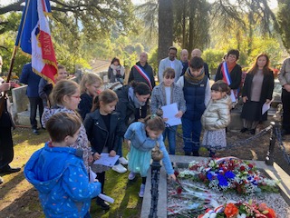Le message de l’Union Fédérale des Associations d’Anciens Combattants a été lu par les enfants qui ont ensuite déposé une rose sur le monument aux morts pour symboliser la paix.