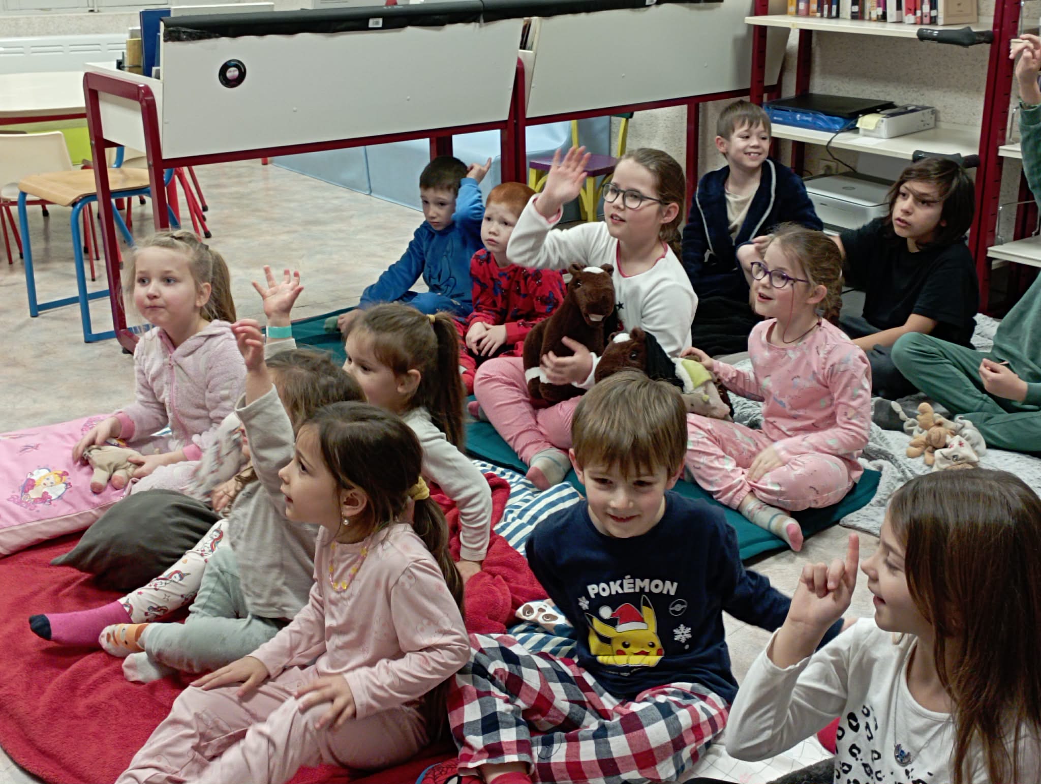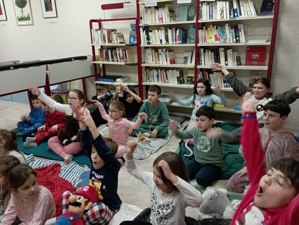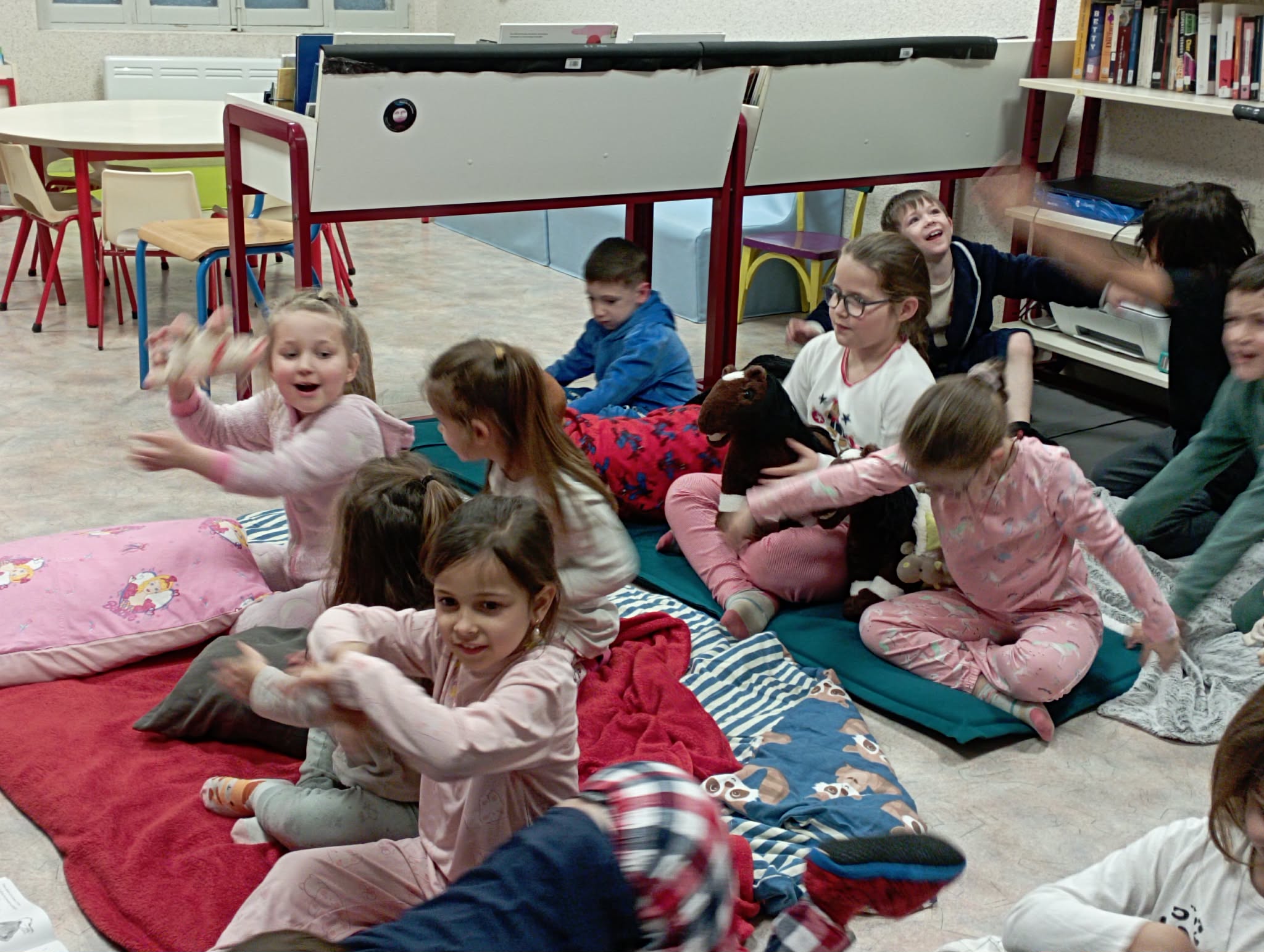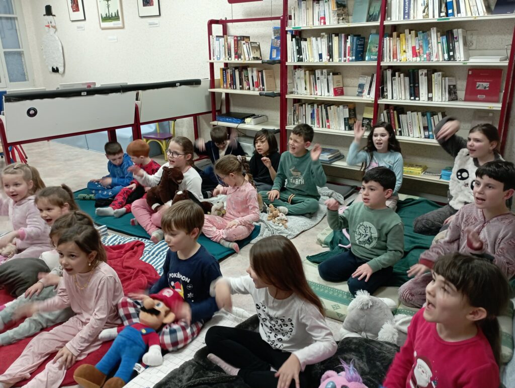 Quelle Aventure !! La soirée pyjama à la bibliothèque des Aires. Ambiance survoltée. Doudous volants et polochons endiablés; histoires gestuelles et drôles….